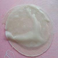 步骤3、 烧一锅开水,将凉皮盘(我用的披萨盘)刷一层油倒入一勺调好的淀粉水晃匀,坐在热水锅里蒸一两分钟,看到起大气泡就可以取出凉皮盘放凉取出凉皮,如图