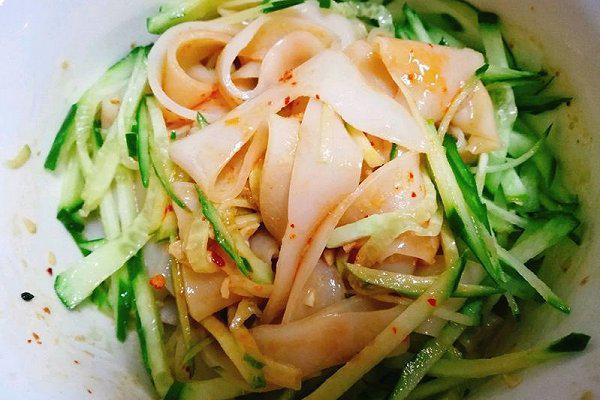 步骤5、 放入自己喜欢的配料拌好就可以了,洗好的面筋可以蒸熟切块放里面一起吃,我的面筋用来做烤面筋了凉皮里面就没有放面筋