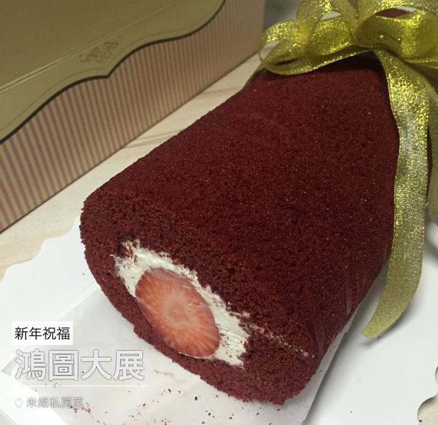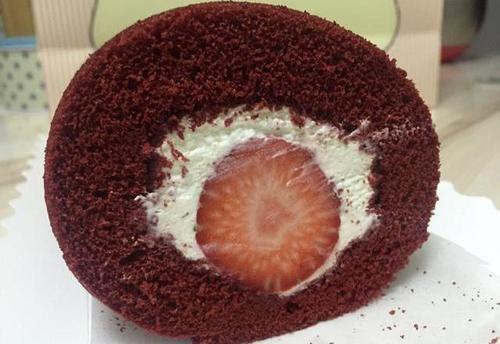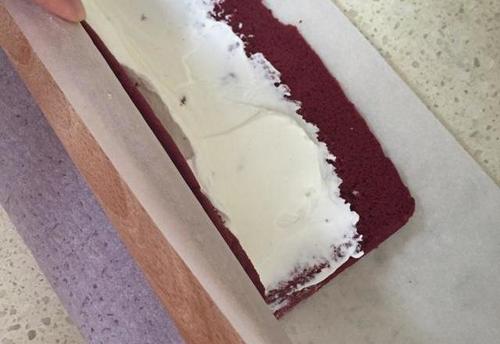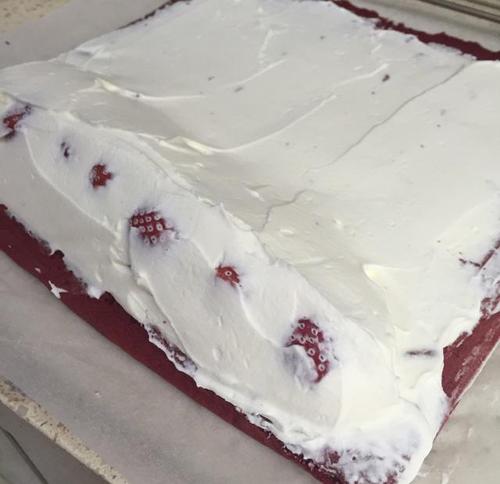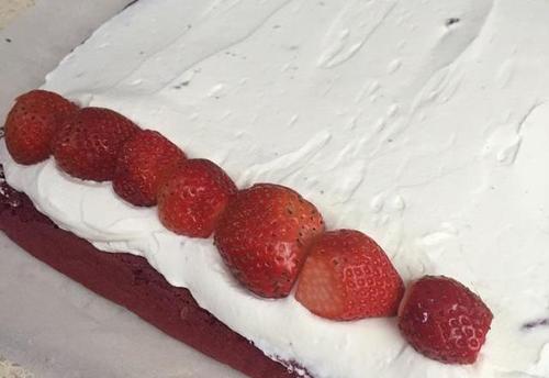 步骤18、我要卷O型卷,用奶油固定住草莓,免得卷的时候走位。