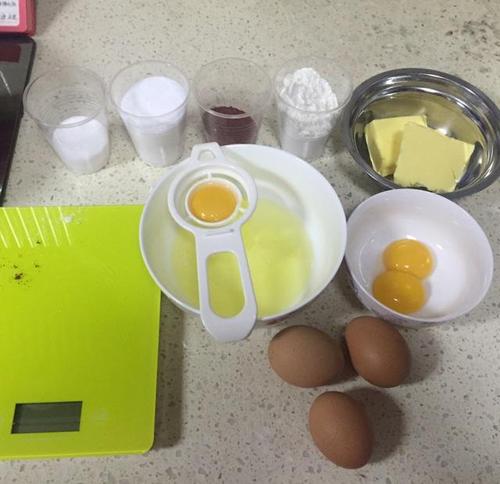 步骤1、称重。我这个图片拍的是一次做两条的份量,方子所有材料×2。蛋黄蛋清分离。