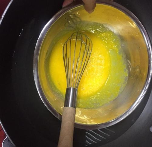 步骤2、细砂糖a加入蛋黄,隔水加热打发至细砂糖融化,蛋黄糊变浅色。