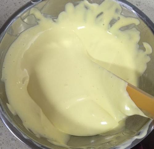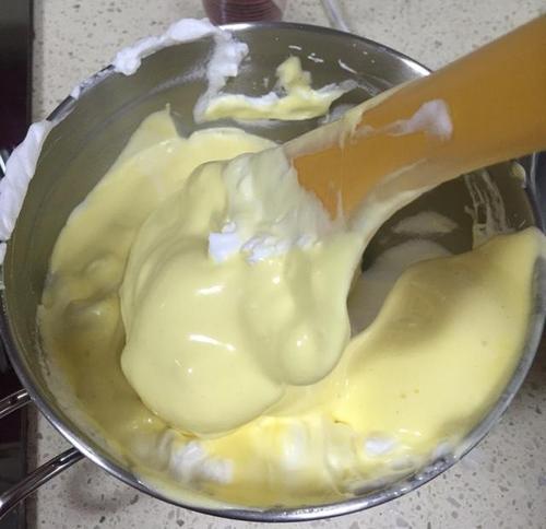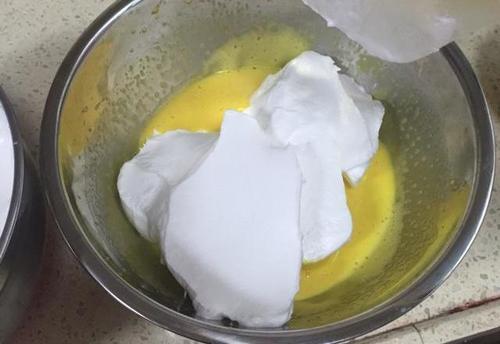 步骤5、三分之一蛋白霜加入蛋黄糊中用刮刀拌匀