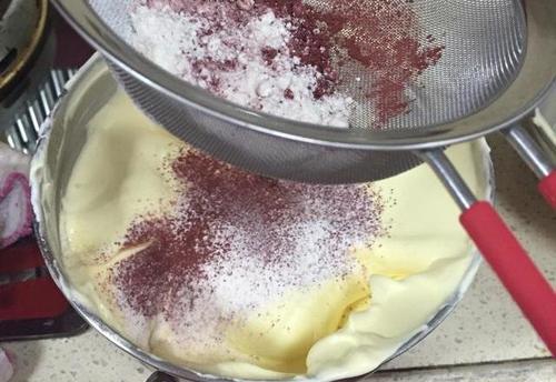 步骤9、分三次筛入低筋面粉和红曲粉。这个时候去预热烤箱。