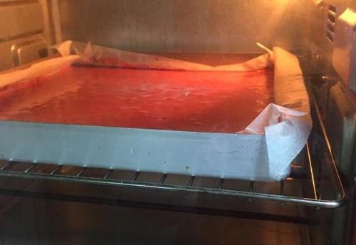 步骤14、把面糊倒入铺好油纸的烤盘中。用的是28*28的烤盘。敲几下烤盘敲出气泡。入预热好的烤箱。