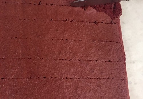 步骤16、出炉趁热扯开四边的油纸,表面盖干净的油纸翻过来,撕掉底下的油纸,再换张干净的油纸铺好,再翻回来。等凉一点,不至于烫手就可以在一边斜斜切掉一点蛋糕。蛋糕面轻划几刀。这样都是为了卷得服贴和不断裂。
