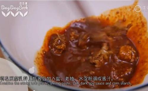 步骤3、将臭豆腐乳拌上虾酱后加入盐、老抽、水淀粉调成酱汁