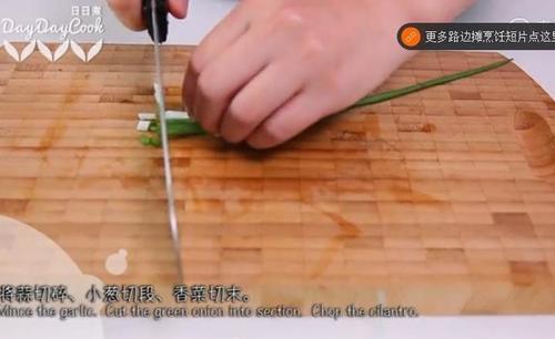 步骤5、将蒜切碎、小葱切段、香菜切末cutcutcut~~