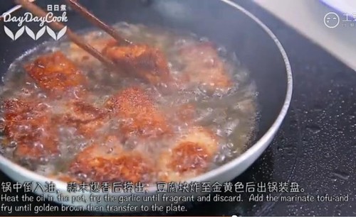 步骤6、锅里倒入油,放入蒜末爆香捞出(一定要捞出来哦),豆腐块炸至金黄色后出锅装盘