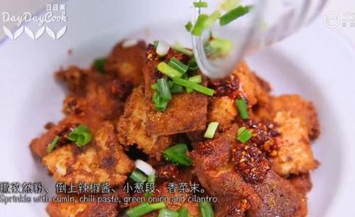 步骤7、撒孜然粉,倒辣椒酱(我用的老干妈,你懂~前面酱汁可以不放盐),撒上葱和香菜