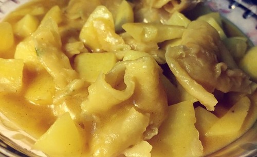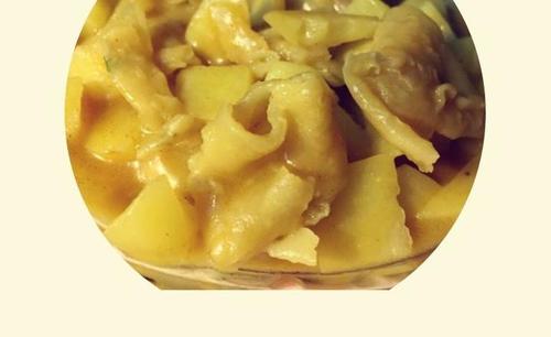 步骤5、大火至冒泡 然后转中小火 不断搅拌防止糊底 三分钟左右后入饼 继续加热 等待土豆块变软即可