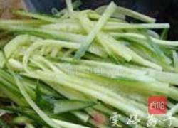 步骤1、黄瓜切成细丝将盐均匀洒在上面,用筷子拌匀,腌制10分钟。然后将腌制出来的黄瓜水倒干净,用纯净水将黄瓜冲洗一下,备用。(黄瓜处理后非常爽脆)。