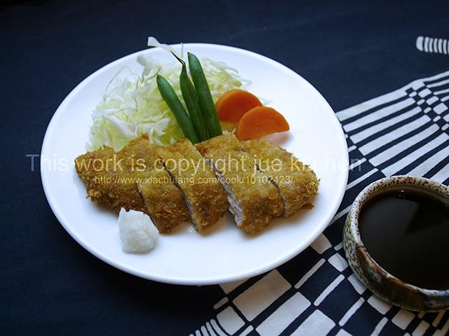 步骤3、用180℃的油温炸已裹上面包粉的里脊排,炸至两面金黄。炸好的里脊排用厨房纸吸去表面的油,切成容易吃的大小。把准备好的卷心菜、胡萝卜、四季豆、萝卜泥以及炸好的里脊排摆盘,将青紫苏沙司淋在蔬菜上,用一小碟装上果醋醤油沾里脊排。