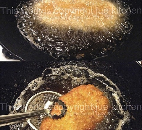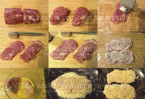 步骤1、猪肉横切面朝上放置,放上一张保鲜膜,用肉锤从上敲打里脊肉成厚厚的猪排形状;撒上盐和胡椒粉腌制片刻,将猪里脊肉依序沾裹:小麦粉(低筋面粉或中筋面粉均可)、蛋液、面包粉,放置10~15分钟;
