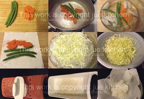步骤2、胡萝卜切成4等分,在沸水中顺序放入胡萝卜、四季豆煮至断生,捞出入冰水或冷水中激凉,用厨房用纸吸干水分,四季豆切去蒂,再切成一半的长度;卷心菜切丝,浸泡在冰水中30分钟,沥水;白萝卜磨成泥,倒入厨房用纸中挤干水备用;