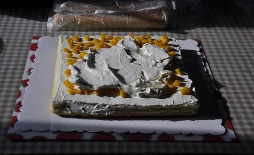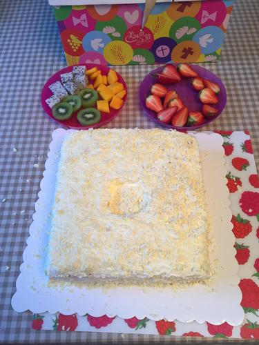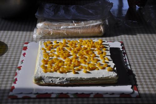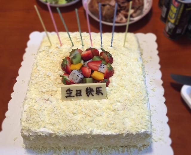 步骤19、横切面还是没有专业的来的光滑,但第一次做那么大的蛋糕,还是在没有裱花台的情况下抹面就只能这样了。