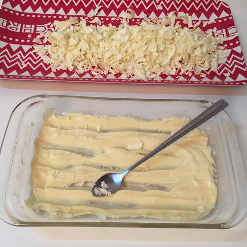 步骤7、巧克力变硬之后,用工具刮下。没有特殊工具用调羹都可以。剩下的白巧克力再次加热溶解制作方形巧克力生日牌。