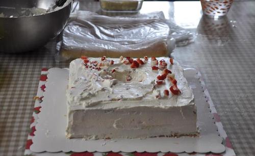 步骤13、抹奶油加草莓粒,奶油全覆盖,抹平
