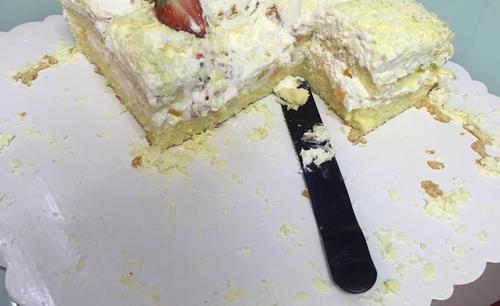 步骤20、好在自己做的蛋糕有个很大的优势,用料足,相对比较纯正,吃起来不腻! 11寸的蛋糕也被消灭的所剩无几。