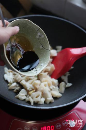 步骤7、加入处理好的藕丁翻炒均匀。倒入糖醋汁