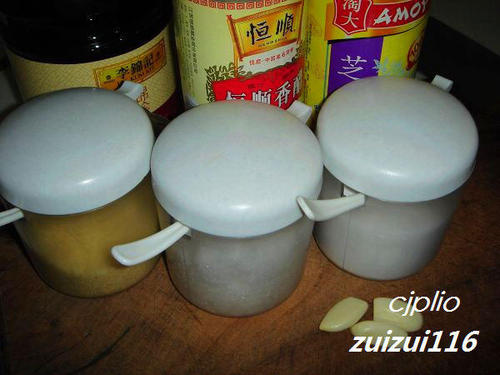 步骤2、辅料,蒜头、香醋、盐、糖、鸡精、生抽、芝麻油