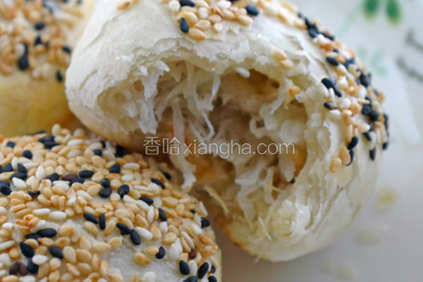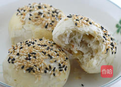 步骤4、包成萝卜丝饼将做成短柱状的油酥皮收口朝上压平,以X方向擀开成圆圆一片,包入35g的萝卜丝馅,像包包子一样用手把收口收紧。一颗蛋打散成蛋汁,用毛刷在表面刷蛋汁,黏上芝麻,收口朝下放在烤盘上。用上火210度下火170度烘烤20分钟。