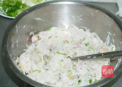 步骤1、白萝卜切成5CM宽的小方块,剉籤。2.将剉籤的萝卜丝加入30g的盐,搓揉两分钟后静置20分钟,这时候萝卜会开始大量出水。之后将萝卜丝放入干净的洗衣袋中拧干待用3.虾皮洗净用水稍为泡一下。4.用一点油爆香,取出后放凉备用。5.葱切成葱花后,跟萝卜丝、虾皮、鲜鸡精、黑白胡椒、绞肉一起搅拌均匀入味。