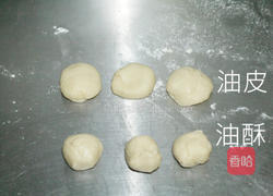 步骤2、制作油皮及油酥A油皮中筋面粉过筛,中间挖一个洞。把65度C的热水缓缓倒入面粉中,准备一双筷子,搅拌水跟面粉到半干。将橄榄油缓缓倒入半干的面团中,继续用筷子搅拌成团,直到看不到面粉,接着用手揉50下。然后用保鲜膜盖起醒面。B.制作油酥:低筋面粉过筛,加入猪油或奶油,用刮刀或手用按压的方式,混合均匀,成黏土般的质感,如果中间有感觉油酥变成像奶油煳的质地表示油溶化了,先放入冰箱冷藏个五分钟再继续操作。