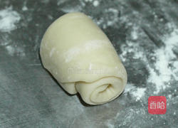 步骤3、制作外皮:将油皮分成20g的小面团,油酥分成16g的小面团并将油酥包入油皮里面,收口收紧朝上,依序排好。将包入油酥的面团,收口朝上用手压扁,接着用擀面棍擀开,再卷起,橄的时候要注意厚薄度要一致。再将卷起的收口朝上,用手压扁,再橄开,再卷成短圆柱状,然后用保鲜膜盖着置放20分钟醒面。