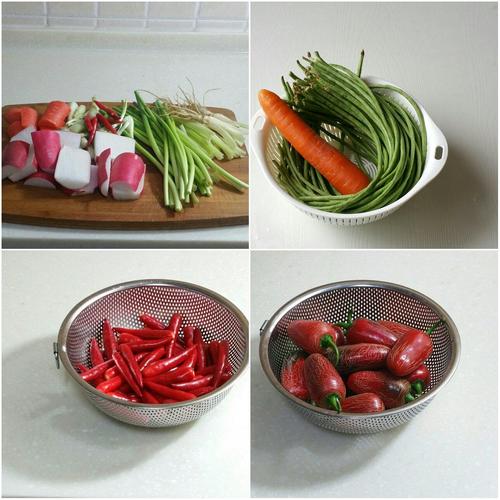 步骤9、这些都是经得起泡的菜,胡萝卜、圆白萝卜、红皮萝卜、和萝卜皮,蒜薹、芹菜带根、豇豆、小米辣椒、圆锥形辣椒