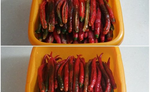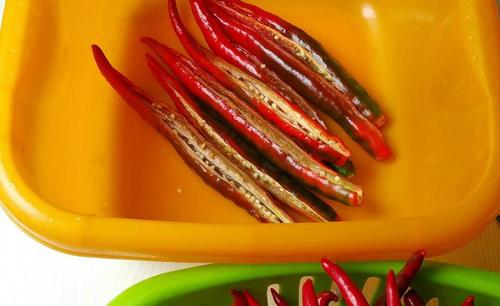步骤11、这是第二次泡的二荆条5斤,这时候更便宜,3元一斤,选择辣椒要新鲜,表皮较硬,上部分暗红,整体光亮为好