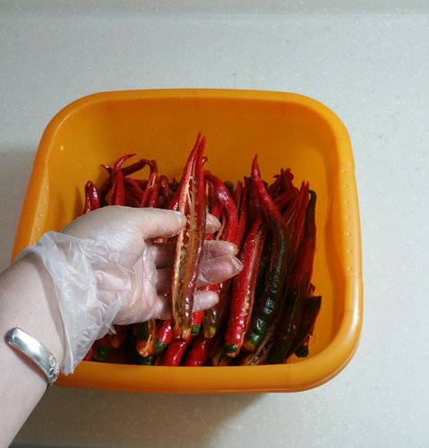 步骤12、辣椒洗净风干水分,用剪刀从辣椒蒂破开至辣椒尖,这种方法泡好的辣椒不涨水,一年以上都不会变得耙软破皮(剪辣椒口一定要带上一次性手套哦)