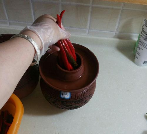 步骤15、将之前泡的菜捞出腾空坛子,全部泡上辣椒再放几个小米辣椒,(不要放得太满,至坛口以下)再倒些腌出的辣椒水进去,这个坛子盐水会越久越好。(剩下更多的辣椒泡在大坛子里)