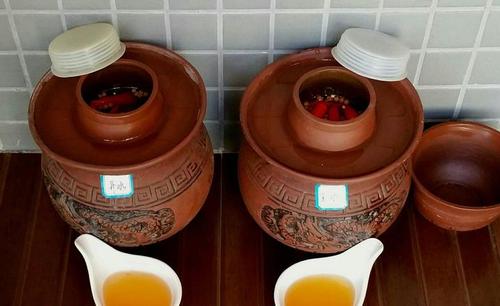 步骤16、两个坛子,泡的二荆条辣椒到今天有10天,开盖就闻到好香,盐水非常好,忍不住喝了一小口