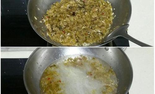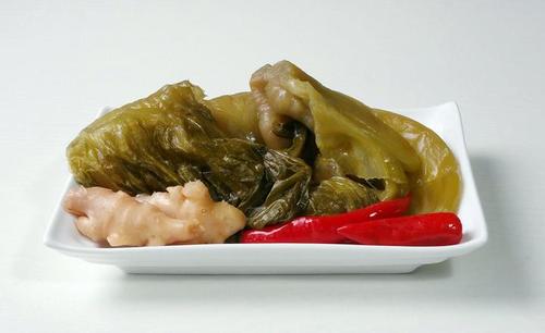 步骤18、酸青菜切细,油锅中加花椒、干辣椒炒香,放入切细的青菜炒片刻,晾凉装密封容器,放冰箱,随用随取很方便