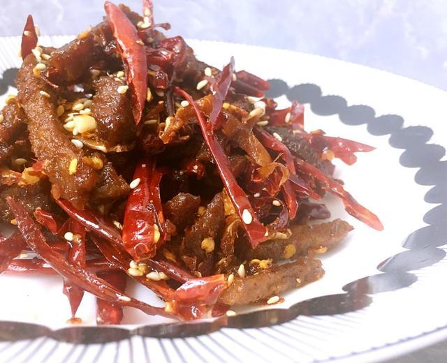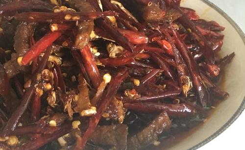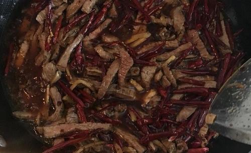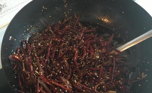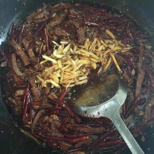 步骤8、牛肉干一点后,加入剩下的姜丝和干辣椒,不停翻炒
