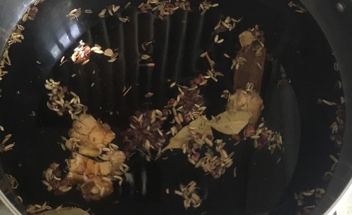 步骤2、水里放香料,老姜,料酒,冰糖,盐,老抽煮一会儿,煮出香味