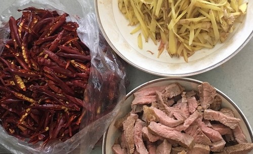 步骤4、干辣椒和老姜切丝,牛肉切条