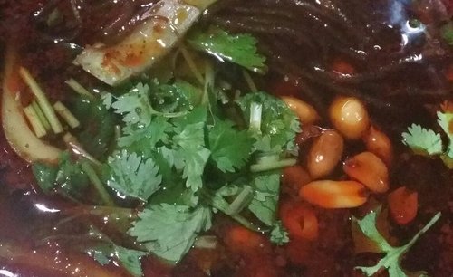 步骤5、捞出煮了两分钟左右晶莹剔透的红薯粉,开水中下入青菜,烫熟(不要煮过),放碗里浇上酸辣汤、蚝油、浇蒜汁、摆青菜、香菜、花生米、酥黄豆,开吃