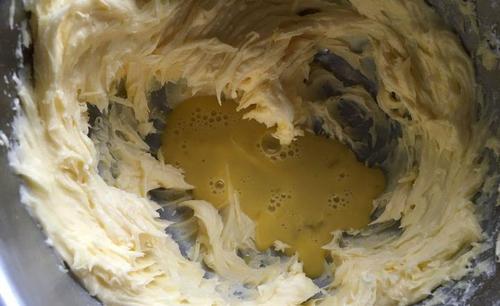 步骤3、然后分3次加入鸡蛋液,每一次都搅打至鸡蛋液完全融入黄油里再加入下一次鸡蛋液。