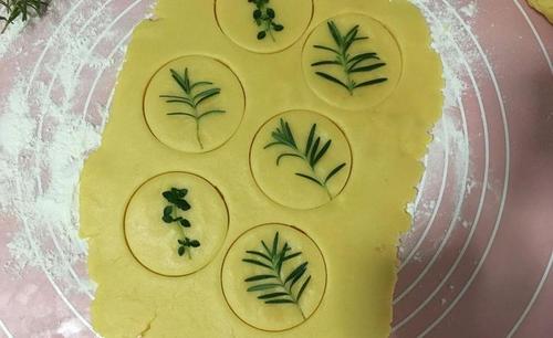 步骤6、提前将香草清洗干净后沥干水分。案板撒少许面粉防沾,将冷藏后的面团取出擀成一个很薄的大面片。然后将香菜贴在面片上,然后用一个圆形磨具压出一个圆形。如果香草不容易贴在面片上,可以在香草上沾少许水分,用手指在轻轻按压一下。做好的饼干放入烤盘里,180度,烤12-15分钟左后。由于各家烤箱功率大小不一,烤箱时间和温度仅供参考。最后剩下的边角料面片,可以在重新揉一下,然后在擀成面片,贴香草,压出形状。这样可以最大限度的减少浪费食材哦!