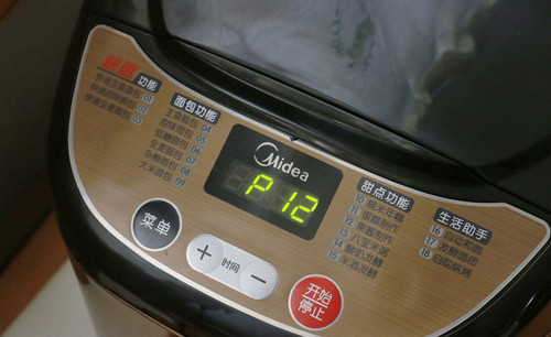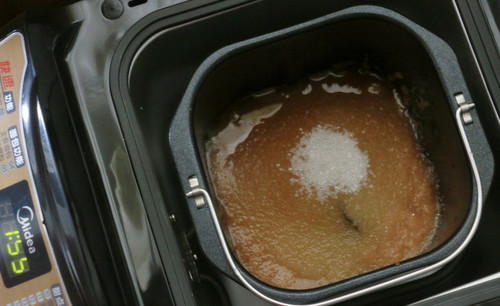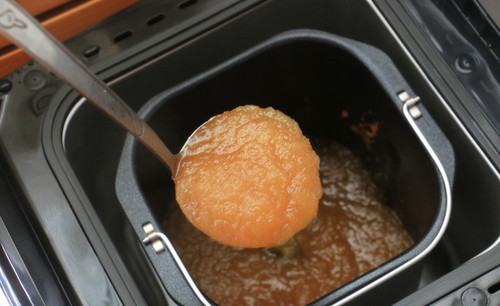 步骤4、苹果泥、砂糖倒入面包机桶里。选择“果酱”功能,启动面包机。