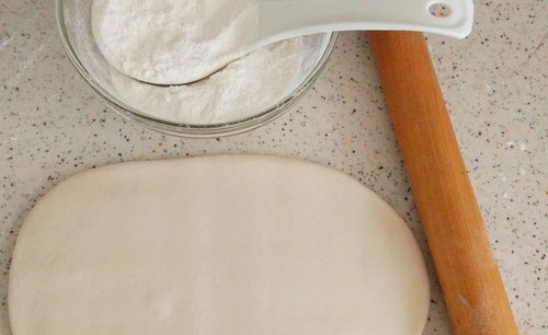 步骤2、案板上洒一些面粉,以免粘连,把面团切成两半。把半个面团用擀面杖擀平