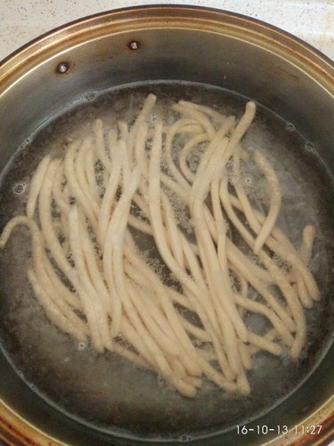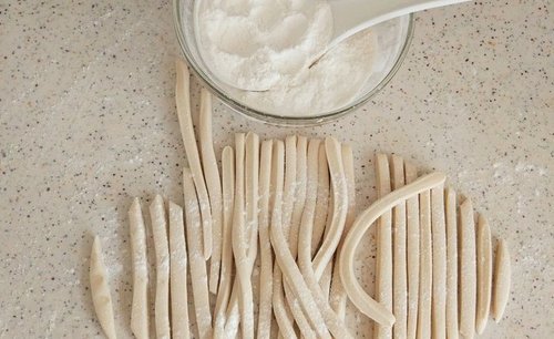 步骤3、用刀切成细条,再洒一些面粉,以免粘连,把细条拉长即可,另外半个面团同上面的步骤。