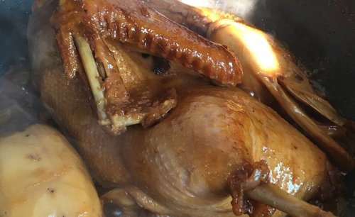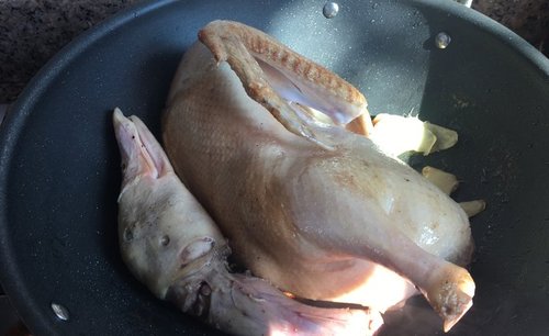 步骤1、姜片,大葱下锅,爆香。把鸭下锅,煎得外皮金黄。