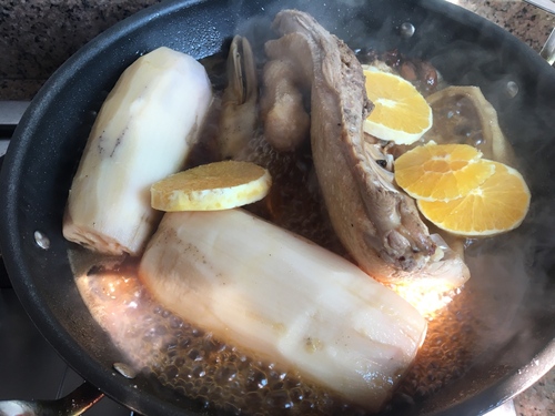 步骤2、加入料酒,酱油,冰糖,清水之后,放入八角,草果一起煮。水开后,加入橙片(去皮)。