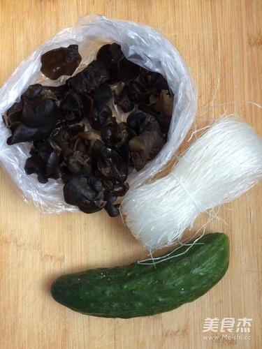 步骤1、木耳提前泡发,放入水中焯水,焯熟备用,准备好粉丝,黄瓜。