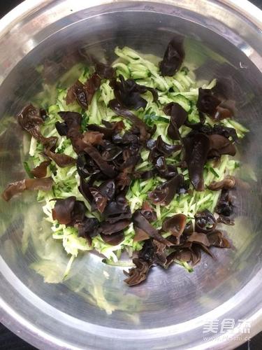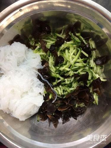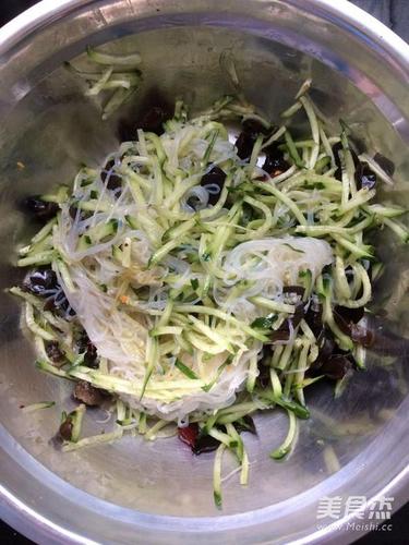 步骤3、木耳切宽条放入黄瓜丝中