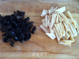 步骤4、将泡好的腐竹改刀,水发木耳切条