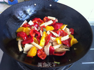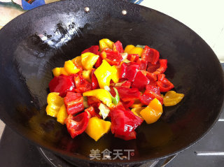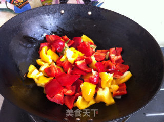 步骤5、锅烧热葱花炝锅炒出香味后倒入彩椒翻炒