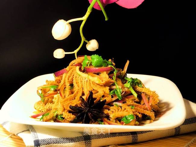 步骤1、牛百叶要把每一片叶子翻开洗净,切丝。